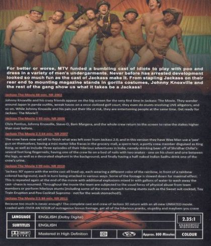 Because too much is never enough! The complete cast and crew of Jackass 3D return with an all-new UNRATED movie. Loaded with OVER AN HOUR of outrageous bonus footage, get all of the hilarious pranks, stupidity and mayhem you crave with Jackass 3.5.