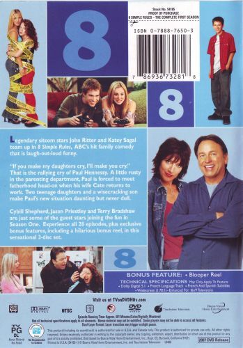 Legendary sitcom stars John Ritter and Katey Sagal team up in 8 Simple Rules, ABC's hit family comedy that is laugh-out-loud funny. "If you make my daughters cry, I'll make you cry." That is the rallying cry of Paul Hennessy. A little rusty in the parenting department, Paul is forced to meet fatherhood head-on when his wife Cate returns to work. Two teenage daughters and a wisecracking son make Paul's new situation daunting but never dull. Cybill Shepherd, Jason Priestley and Terry Bradshaware just some of the guest stars joining the fun in Season One. Experience all 28 episodes, plus exclusive bonus features, including a hilarious bonus reel, in this sensational 3-disc set.