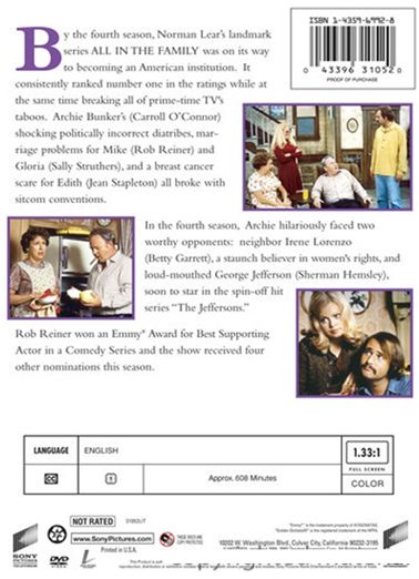 By the fourth season, Norman Lear's landmark series ALL IN THE FAMILY was on its way to becoming an American institution. It consistently ranked number one in the ratings while at the same time breaking all of prime time TV's taboos. Archie Bunker's (Carroll O'Conner) shocking politically incorrect diatribes, marriage problems for Mike (Rob Reiner) and Gloria (Sally Struthers), a breast cancer scare for Edith (Jean Stapleton) all broke with sitcom conventions.