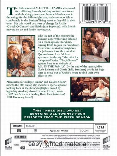 Expecting anything resembling growth from Archie Bunker is like asking the sun to rise in the west: it ain't gonna happen. Accordingly, the most unrepentantly incorrigible character in TV sit-com history is his old self throughout this three-disc box set, which includes all 24 episodes from the fifth season of producer Norman Lear's All in the Family. Which is to say that Archie (played brilliantly as always by Carroll O'Connor) is an irascible, intolerant, sexist, ignorant, cheap misanthrope. Funny, too.