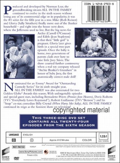 The more things change, the more they stay the same? When it comes to All in the Family, the answer is an unqualified yes? and no. Considering the show's tremendous popularity (this sixth season, spanning 1975 and '76, was the fifth straight year it held down the top spot in the Nielsen ratings), creator-producer Norman Lear was unlikely to make any drastic adjustments to the basic formula. And sure enough, in these 24 episodes (on three discs, sans bonus features), the four main characters--Archie Bunker (Carroll O'Connor, brilliant as ever), ditzy wife Edith (Jean Stapleton), daughter Gloria (Sally Struthers), and contentious son-in-law Mike Stivic (Rob Reiner)--and their relationships remain the obvious focal point. What's more, while it's true that various new developments, including Mike and Gloria's move next door (to the house once occupied by the Jeffersons), her pregnancy, and the birth of little Joey, are more than cosmetic and account for the lion's share of the storylines, All in the Family's basic dynamic remains one of the strongest and most instantly recognizable in TV sitcom history. Ditto the writers' penchant for the trenchant; social issues include tolerance and homophobia (Archie saves a woman's life with "mouth-to-mouth restitution," only to discover that "she" is a transvestite), women's rights (Gloria gets fired for being pregnant), vigilantism (Archie fends off a mugger with illegal tear gas), religion (Archie wants his grandson baptized and raised as a Christian, but Mike has other ideas), and so on. And now more than ever, some of the language will seem a little shocking, as Archie regularly uses a variant of the gay slur that got Grey's Anatomy cast member Isaiah Washington in very hot water more than three decades later.