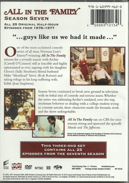 One of the most acclaimed comedy series of all time, Norman Lears Emmy-winning All In The Family returns for a seventh season with Archie (Carroll O Connor) still as irascible and highly opinionated as ever, arguing with his daughter Glorias (Sally Struthers) liberal husband Mike Meathead Stivic (Rob Reiner) and taking refuge in his long-suffering wife, Edith (Jean Stapleton).