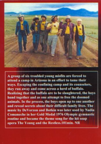"Exciting and well-intentioned, if repetitious, story of six young misfit boys, campers at a ranch, who attempt to free a captive herd of buffalo scheduled for slaughter." (3 stars) Leonard Maltin's Movie and Video Guide