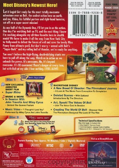 Bolt is the star of the biggest show in Hollywood. The only problem is, he thinks the whole thing is real. When the super dog is accidentally shipped to New York City and separated from Penny, his beloved co-star and owner, Bolt springs into action to find his way home. Together with hilarious new sidekick Rhino, Bolt's #1 fan, and a street-smart cat named Mittens, Bolt sets off on an amazing journey where he discovers he doesn't need super powers to be a hero.