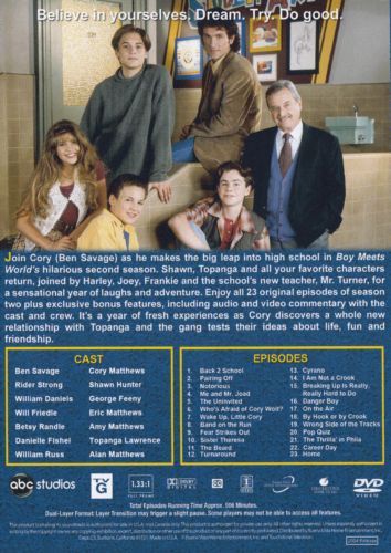 Enjoy all 23 original episodes of season two plus exclusive bonus features, including audio and video commentary with the cast and crew. It's a year of fresh experiences as Cory discovers a whole new relationship with Topanga and the gang tests their ideas about life, fun and friendship.