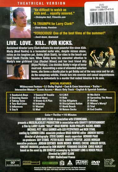 Photographer and filmmaker Larry Clark, who made a controversial feature debut with the disturbing drama Kids, returns with another disquieting look at amoral and sexually precocious youth. Bobby (Nick Stahl) is a high school student growing up in southern Florida in the early '90s. Bobby is also a borderline psychotic; he frequently lashes out with brutal violence against those around him and especially enjoys humiliating his best friend Marty (Brad Renfro). While Bobby professes to hate and fear homosexuals, he goads Marty into performing phone sex with men, makes Marty and his friends watch hardcore gay porn films with him, and may have sexually abused Marty. But Marty is hardly the only victim of Bobby's abuse; Bobby has sexually assaulted Marty's girlfriend Lisa (Rachel Miner) and more than once has barged in on the couple while they were making love. Lisa's best friend Ali (Bijou Phillips) has also been raped by Bobby, and he has mistreated nearly everyone in their circle of friends. One night, Marty, Lisa, Ali, and several others decide Bobby's cycle of abuse must stop. But their solution is as ugly as the problem — the teens stab Bobby, slit his throat, crush his head with a baseball bat, and throw his body into the bay, where the remains will be eaten by alligators. Bully is based on a book by journalist Jim Schutze, which recounted the facts of the 1993 murder of Bobby Kent, who after years of abusing his friends and classmates, was killed by seven of his acquaintances in Ft. Lauderdale, FL. As with Kids, Larry Clark's startlingly graphic depiction of sex, violence, and drug use among teenagers crossed the boundaries of what the MPAA could permit in an R-rated film, and the picture's distributors chose to release the film without a rating. — Mark Deming