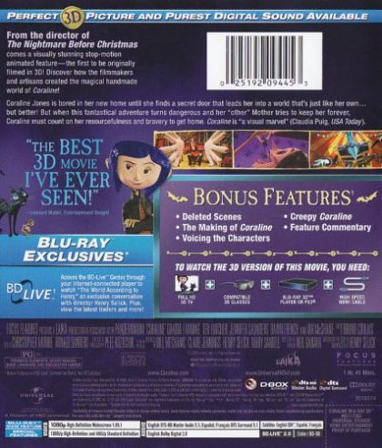 Coraline is a 2009 stop-motion 3D fantasy children's film based on Neil Gaiman's 2002 novel of the same name. It was produced by Laika and distributed by Focus Features. Written and directed by Henry Selick, it was released widely in US theaters on February 6, 2009, after a world premiere at the Portland International Film Festival.The film made $16.85 million during opening weekend, ranking third at the box office. As of September 2009, the film has grossed over $120 million worldwide. Coraline won the Annie Awards for best music, character design, and production design and received an Academy Award and Golden Globe nomination for Best Animated Feature.An adventurous girl finds another world that is a strangely idealized version of her frustrating home, but it has sinister secrets.