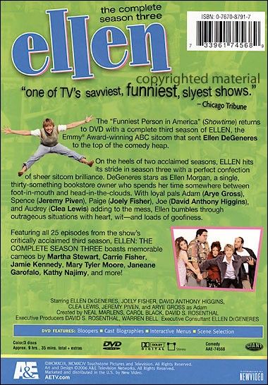 Lest there be any doubt that Ellen DeGeneres is one of America's most fearless and hilarious comedians, Ellen's third season should dispel it once and for all. Considered by many to be the '90s series' best season, it showcases DeGeneres and the crackling interaction with her stellar supporting cast. This is the season that introduced the incomparable Jeremy Piven (who'd go on to shine in HBO's Entourage) as Ellen's sad-sack cousin, Spence. Ellen's flawed but loyal collection of pals (and her mom) spins around her in their own ditsy or self-absorbed orbits, as Ellen the Everygal tries to navigate the challenges of her life, from rebuilding her bookstore after the '94 earthquake, to soul-searching What It All Means. Great bits abound, like the ongoing debate over the difference between "I love you" and "I love ya." And DeGeneres is never afraid to be silly, which often results in the biggest belly laughs (watch her perform defibrillation and CPR--on the cardboard patient in the game "Operation"). This was also the season in which a recurring gag involved the lack of a new credits-sequence, and the joke just gets funnier the longer it goes on. The set includes 24 episodes and a set of priceless bloopers. Ellen, we love ya. And you. --A.T. Hurley
