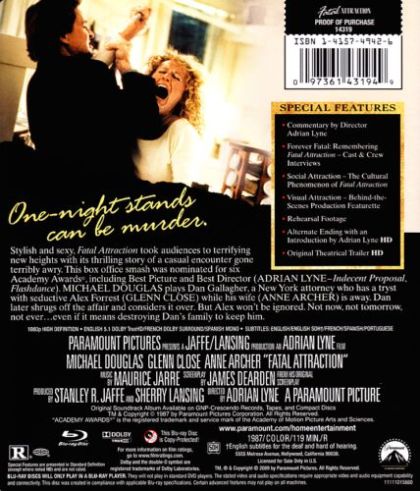 "Fatal attraction" has become a household term for love turned to murderous obsession, thanks to the success of Adrian Lyne's 1987 movie. Dan (Michael Douglas) is a family man whose one-night affair with Alex (Glenn Close) turns into a nightmare when she insists on continuing the relationship, claiming to be carrying his baby. Alex systematically terrorizes Dan, even temporarily kidnapping his daughter, in her attempts to win back his affection. Douglas' besieged family man guiltily tries to preserve his marriage and family from the consequences of his own indiscretion. Close's performance as the love-struck psycho-siren remains her signature role: She conveys the buried feminist message of the film in her challenge to Dan to take responsibility for his sexual behavior.