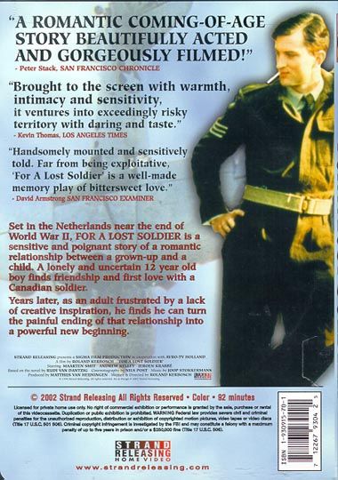 Set in the Netherlands near the end of WWII, For a Lost Soldier is a sensitive and poignant story of a romantic relationship between a grown-up and a child. A lonely and uncertain 12 year old boy finds friendship and first love with a Canadian soldier.