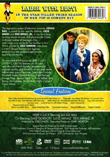 The complete third season of HERE'S LUCY (1970-71, CBS-TV) features all 24 color episodes uncut and digitally remastered for superior quality, plus a wealth or new and never- before-seen special features. Guest stars include Elizabeth Taylor, Richard Burton, Carol Burnett, Vincent Price, Sammy Davis Jr., Rudy Vallee, Jack Benny, Art Linkletter, Buddy Rich, Wally Cox and Vivian Vance.