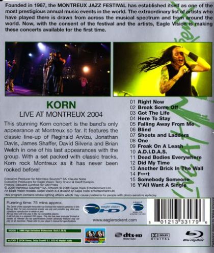 Korn came out of California in the early nineties and went on to become one of the most globally successful metal acts of their generation. They continue to play live to vast crowds and have record sales in the millions. This concert from Montreux in 2004 is their only performance at the festival to date. It was to be one of the last shows to feature the band's original line-up with guitarist Brian Welch leaving the group a few months later. Korn transforms the normally reserved Montreux crowd into seething, rocking mass with the largest (& probably the first!) mosh pit ever seen in the famous Stravinski Auditorium.
