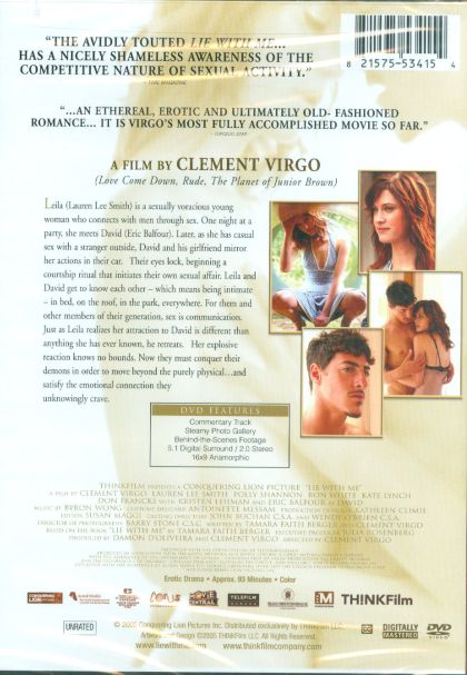 Shot in sunny Toronto and set to a dreamy score, Lie With Me looks and sounds like an art film, but the end result isn't quite so lofty. The plot is thin and the dialogue superfluous, but no matter--Canada's Clément Virgo (Love Come Down) just wants to turn you on and he has enlisted two attractive, uninhibited young performers to assist in his aims. Leila (Lauren Lee Smith, The L Word) and David (Eric Balfour, Six Feet Under) meet at a party. He's with his girlfriend, but finds himself drawn to her. The feeling is mutual. She's alone, but quickly finds an unattached hipster with whom to have a tryst. David catches her in the act. Instead of turning away, he watches. They start seeing each other immediately afterwards. "I'm not hooked on danger, [I'm] hooked on sex," Leila claims, but she isn't exactly the most trustworthy narrator. She wants a purely physical relationship, while David wants something more. They return to their old lives, but the obsession refuses to die. Based on the novella by Virgo's partner, Tamara Berger, Lie With Me plays like a low-budget cross between Adrian Lyne's overrated 9 1/2 Weeks and Wayne Wang's underrated The Center of the World. --Kathleen C. Fennessy