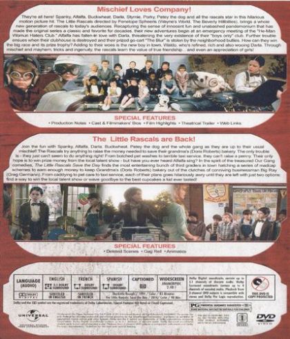 The Little Rascals are back in an all-new movie! Join the fun with Spanky, Alfalfa, Darla, Buckwheat, Petey the dog and the whole gang as they are up to their usual mischief! The Rascals try anything to raise the money needed to save their grandma's (Doris Roberts) bakery. The only trouble is - they can't seem to do anything right! From botched pet washes to terrible taxi service, they just can't raise a penny. Their only hope is to win prize money from the local talent show - but have you ever heard Alfalfa sing?