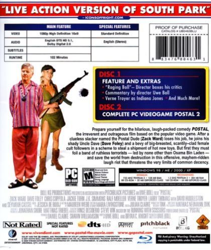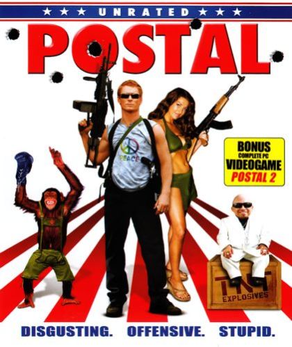 Postal is a movie based on the controversial game series of the same name. The film is about a laid off factory worker known only as "Postal Dude" (Zack Ward), who joins up with his Uncle Dave (Dave Foley), a man who runs a doomsday cult. Uncle Dave hires his nephew to help him steal a shipment of Krotchy dolls (a doll shaped like a scrotum who utters phrases such as "only my priest and my father are allowed to touch me there"), so he can sell them online and pay back the IRS. The only problem is that Al Queda is also after the dolls so they can infect them with avian bird flu.