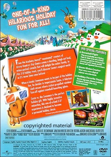 The kid-friendly Santa vs. the Snowman began as a 1997 animated television special, then made a leap to the biggest movie screens--IMAX--in the world (in 3-D, no less), and now has come full circle to DVD with its extra, simulated perspective and deep focus intact. (3-D glasses, which come with the disc, are required.) An animator's lark, Santa concerns a battle between Mr. Claus and a scheming snowman who tries to overtake Santa's toy-making and Christmas Eve delivery operation. A full-scale war erupts (there are some scary images here, particularly of a snowman writhing to his fiery death), though the violence is mitigated by clever quotes from movie and animation classics, including Toy Story and the stop-motion television perennial Santa Claus Is Comin' to Town. The original 2-D geometric planes are artfully reinvented to achieve an exciting depth. --Tom Keogh