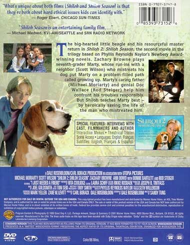 They say you can't teach an old dog new tricks. But can a kid help an old grouch change his ways? Picking up immediately where the 1996 family favorite Shiloh left off, Shiloh 2: Shiloh Season continues the drama of a boy, his dog, and the dog's menacing original owner. Zachary Browne plays the part of Marty Preston, the young boy who rescued an abused beagle by standing up to local troublemaker Judd Travers (another convincing performance by Scott Wilson). Although Marty and Judd struck a deal, Judd seems bent on making the boy and his family pay in more ways than one for keeping Shiloh. Fueled by alcohol, Judd's suspicious character and his tendency to shoot whatever critters he pleases deeply disturb young Marty. Once again, the boy risks his own safety and exercises immense courage and compassion to turn Judd into a friend. Michael Moriarty and Rod Steiger reprise their roles as Marty's father and Doc Wallace, respectively. Because the sequel leans heavily on the original movie's plot, it loses its punch as a stand-alone show. Slightly tougher subject matter (the effects of alcoholism, in particular) warrants a slightly older audience; families with 7- to 12-year-olds should fare well. Based on the second book, Shiloh Season, in Phyllis Reynolds Naylor's popular children's trilogy. --Liane Thomas