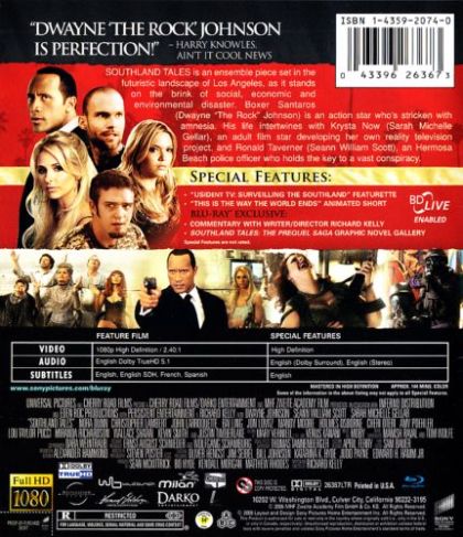 “Southland Tales” tells the story of four people with intertwining cosmically-influenced lives living in a post-apocalyptic Southern Californian landscape writhe with political, economic, and social turmoil. We follow the lives of Boxer Santaros (Dwayne Johnson), an action star suffering from Amnesia, Krysta Now (Sarah Michelle Geller), a former porn-star, and twin brothers Roland and Ronald Taverner (Sean William Scott). They are governed by an expanse of the patriot act called US-IDENT that monitors the citizens every move. Additionally, an attempt to create a new fuel source brings about “Liquid Karma” whose use sends Earth into an uncontrolled spiral through space and time. One night the destiny of all mankind will be decided forever.