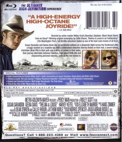 Thelma & Louise is a feminist manifesto writ large on the big screen, a smart and funny gender reversal of the standard Hollywood buddy formula, a road movie extraordinaire, with characters who became instant cultural icons. No matter how you define it, Ridley Scott's 1991 box-office hit pinched a nerve and made the cover of national news magazines for tweaking gender politics like no movie before or since. Callie Khouri's screenplay overhauls the buddy formula with its story about two best friends (Susan Sarandon and Geena Davis) who embark on a liberating adventure that turns into an interstate police chase after a traumatic incident makes both women into fugitives; they are en route to a destiny they could never have imagined. The perfect casting of Sarandon and Davis makes Thelma & Louise a movie for the ages, and Brad Pitt became an overnight star after his appearance as the con-artist cowboy who gives Davis a memorable (but costly) night in a roadside motel.
