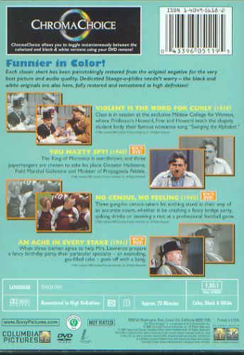A quartet of Three Stooges shorts (three new to DVD) make up this solid disc, all with mid-period Curly in woo-woo-woo form. "Violent is the Word for Curly" somehow morphs the boys from gas-station attendants to European college professors. Not only does it feature Curly roasting on a spit, but the Stooges instruct the students of Mildew College for Women in the intricacies of "Swinging the Alphabet," a memorable nonsense song. "You Nazty Spy" is the Stooges' answer to Duck Soup and The Great Dictator, as a cabal of businessmen install Moe as the dictator of Moronika. With an accidental mustache and jibbering German, Moe does a convincing Hitler. (But didn't he always?)