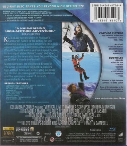 Vertical Limit is an exciting adventure film about mountain climbing. Nature photographer Peter Garratt(Chris O'Donnell) tries to rescue his sister Annie(Robin Tunney), who is trapped in a cravasse on K2, the second highest mountain in the Himalayas, above the vertical limit, where human life cannot be sustained. Peter, already feeling guilty about his father's death in a climbing incident, doesn't know that a member of his volunteer rescue party is secretly working against him. Adding to the tension, the rescuers carry explosives with them as they make their way up the mountain. The film contains many breathtaking action sequences of climbers risking death.