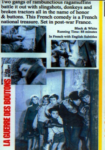 In this gentle anti-war comedy, a class of French schoolboys divides into two factions who begin to battle each other, with the victors claiming the buttons off the clothes of the vanquished. One day, some of the boys pull a strategic coup by running into battle naked, therefore leaving their enemies nothing to steal. However, after this stunning victory, one of their number turns traitor to the other side, helping them plot a secret attack that leaves the recent champions in defeat. The informer is eventually found out and punished for his crimes, so he takes the matter to a higher authority and tells his parents he's been beaten up by bullies. Soon Mom and Dad are making trouble for their son's schoolmates, with the culprits facing a stay in juvenile hall. La Guerre des Boutons was written and directed by Yves Robert, who had a distinguished career both in front of and behind the camera in the French cinema.