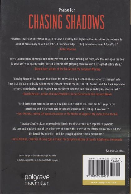 On a warm Saturday night in July 1973 in Bethesda Maryland, a gunman stepped out from behind a tree and fired five point-blank shots into Joe Alon, an unassuming Israeli Air Force pilot and family man. Alon's sixteen-year-old neighbor, Fred Burton, was deeply shocked by this crime that rocked his sleepy suburban neighborhood. As it turned out, Alon wasn't just a pilot—he was a high-ranking military official and with intelligence ties. The assassin was never found and the case was closed. In 2007, Fred Burton—who had since become a State Department counterterrorism special agent—reopened the case. Here, in Chasing Shadows, Burton spins a gripping tale of the secret agents, double dealings, terrorists and heroes he encounters he chases leads around the globe in an effort to solve this decades-old murder. From swirling dogfights over Egypt and Hanoi to gun battles on the streets of Beirut, this action-packed thriller looks in the dark heart of the Cold War to show power is uses, misused, and sold to the most convenient bidder.