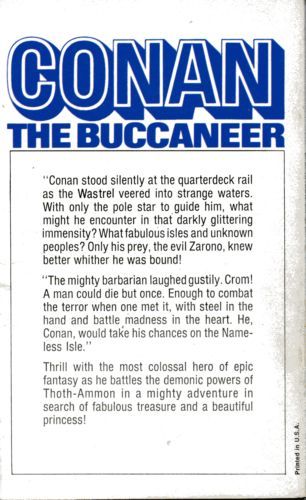 "Conan stood silently at the quarterdeck rail as the Wastrel veered into new and strange waters. Once off the coast of the continent, with only the pole star to guide him, what might he encounter in that darkly glittering immensity? What fabulous isles and unknown peoples? What weird monsters? Oh, his prey, the evil Zarono, knew better whither he was bound! Then the mighty barbarian laughed gustily. Crom! A man could die but once. Enough to combat the terror when once met it, with steel in the hand and battle madness in the heart. He, Conan, would take his chances on the Nameless Isle, ahead of him on the rim of the world!"--Back cover