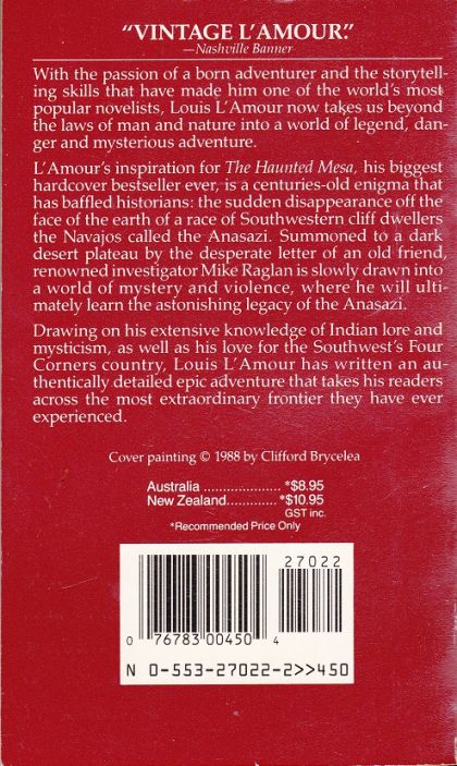 The Navajo called them the Anasazi: an enigmatic race of southwestern cliff dwellers. For centuries, the sudden disappearance of this proud and noble people has baffled historians. Summoned to a dark desert plateau by a desperate letter form an old friend, renowned investigator Mike Raglan is drawn into a world of mystery, violence, and explosive revaltion. Crossing the border beyond the laws of man and nature, he will learn the astonishing legacy of the Anasazi -- but not without a price. Set in the contemporary Southwest, "The Haunted Mesa draws on Louis L'Amour's extensive knowledge of Indian lore and mysticism. In this extraordinary book L'Amour tells a tale of epic adventure that takes his readers across the most extraordinary frontier they have ever encountered.
