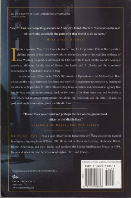 In his explosive New York Times bestseller, top CIA operative Robert Baer paints a chilling picture of how terrorism works on the inside and provides startling evidence of how Washington politics sabotaged the CIA’s efforts to root out the world’s deadliest terrorists, allowing for the rise of Osama bin Laden and Al Qaeda and the continued entrenchment of Saddam Hussein in Iraq.A veteran case officer in the CIA’s Directorate of Operations in the Middle East, Baer witnessed the rise of terrorism first hand and the CIA’s inadequate response to it, leading to the attacks of September 11, 2001. This riveting book is both an indictment of an agency that lost its way and an unprecedented look at the roots of modern terrorism, and includes a new afterword in which Baer speaks out about the American war on terrorism and its profound implications throughout the Middle East.“Robert Baer was considered perhaps the best on-the-ground field officer in the Middle East.”–Seymour M. Hersh, The New YorkerFrom The PrefaceThis book is a memoir of one foot soldier’s career in the other cold war, the one against terrorist networks. It’s a story about places most Americans will never travel to, about people many Americans would prefer to think we don’t need to do business with.This memoir, I hope, will show the reader how spying is supposed to work, where the CIA lost its way, and how we can bring it back again. But I hope this book will accomplish one more purpose as well: I hope it will show why I am angry about what happened to the CIA. And I want to show why every American and everyone who cares about the preservation of this country should be angry and alarmed, too.The CIA was systematically destroyed by political correctness, by petty Beltway wars, by careerism, and much more. At a time when terrorist threats were compounding globally, the agency that should have been monitoring them was being scrubbed clean instead. Americans were making too much money to bother. Life was good. The White House and the National Security Council became cathedrals of commerce where the interests of big business outweighed the interests of protecting American citizens at home and abroad. Defanged and dispirited, the CIA went along for the ride. And then on September 11, 2001, the reckoning for such vast carelessness was presented for all the world to see.