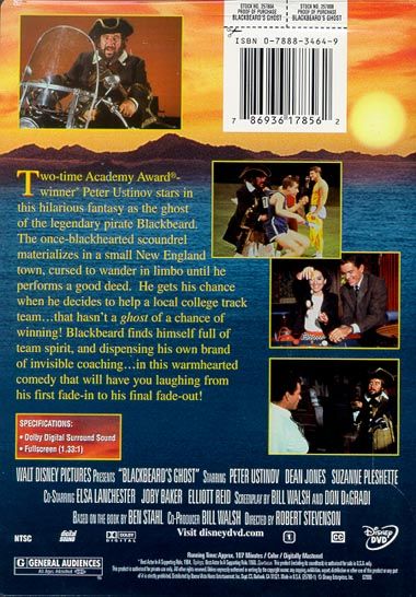 Blackbeard's Ghost was one of the first Disney productions released after Walt's death. Peter Ustinov stars as the eponymous wraith, who returns to Earth to aid his descendant, elderly Elsa Lanchester. The villains want to kick Lanchester and her friends out of their group home so that they can build a crooked casino. Good guy Dean Jones evokes the spirit of Blackbeard to thwart the bad guys.
