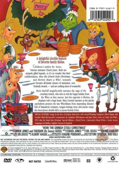 NOTE: Although Dr. Seuss published the book in 1957, it wasn't made into a TV movie until 1966. In a cave in the mountains above Whoville lives a miserable creature known as the Grinch. It was reputed that his heart was two sizes too small. His only companion is his dog. He looks down in rage at the activities of the Whos who live in Whoville. He is especially infuriated by their Christmas celebrations and their cheery songs. He gets the idea that if he steals everything they have related to Christmas, he can stop the holiday from coming. Dressing as Santa Claus and his dog as a reindeer to pull his sled, the Grinch heads down the steep slopes. In the dark of night he sneaks from house to house stealing trees, presents, decorations, and Christmas goodies. The only one who sees him is little Cindy Lou Who "who is no more than two". She asks him why he's taking their things, a question he smoothly avoids. After the rigorous climb back up the mountain with the heavily-laden sled, the Grinch is furious when he hears the Whos singing their cheery songs again. After what some say was his heart growing two sizes that day, the Grinch makes the decision to return Christmas to the Whos.