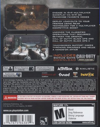 Call of Duty: Black Ops Declassified brings the classic Call of Duty-style gameplay to gamers on-the-go in the most intense handheld Call of Duty experience only on PlayStation Vita. The title features intense 4v4 multiplayer action across popular modes along with the hallmark Call of Duty gameplay, including Care Packages, Create-a-Class, Killstreaks, Perks, and even Prestiging. Delivering an original fiction set within the Call of Duty: Black Ops universe, Declassified offers a complementary series of single player operations. With touchscreen and "Near" features, Call of Duty: Black Ops Declassified puts the adrenaline-rush action of Call of Duty in the palm of your hands.