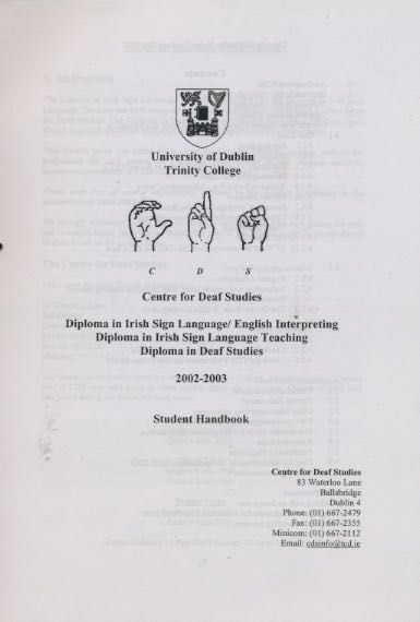 This is a student Handbook for the Centre for Deaf Studies, in Trinity College Dublin. It explains the three strands; ISL interpreting, ISL teaching and general Deaf studies, along with their aims and what is expected of the student.