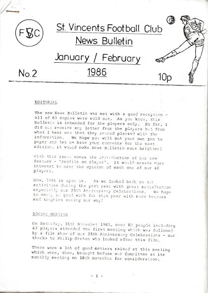 St. Vincent Football Club News Jan/Feb Year 1986