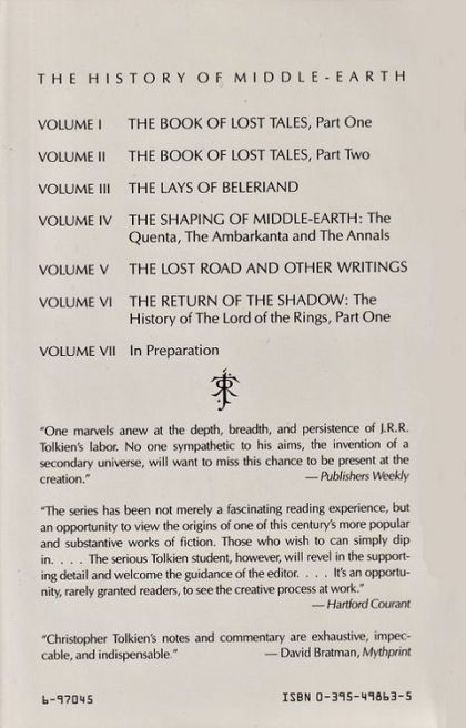 The story in this book ends at the point where J.R.R. Tolkien halted in the story for a long time, as the Company of the Ring, still lacking Legolas and Gimli, stood before the tomb of Balin in the Mines of Moria. The Return of the Shadow is illustrated with reproductions of the first maps and notable pages from the earliest manuscripts.