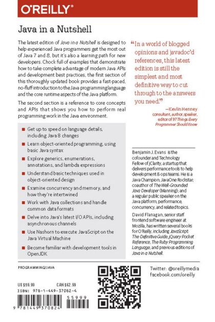 The latest edition of Java in a Nutshell is designed to help experienced Java programmers get the most out of Java 7 and 8, but it’s also a learning path for new developers. Chock full of examples that demonstrate how to take complete advantage of modern Java APIs and development best practices, the first section of this thoroughly updated book provides a fast-paced, no-fluff introduction to the Java programming language and the core runtime aspects of the Java platform. The second section is a reference to core concepts and APIs that shows you how to perform real programming work in the Java environment. Get up to speed on language details, including Java 8 changes Learn object-oriented programming, using basic Java syntax Explore generics, enumerations, annotations, and lambda expressions Understand basic techniques used in object-oriented design Examine concurrency and memory, and how they’re intertwined Work with Java collections and handle common data formats Delve into Java’s latest I/O APIs, including asynchronous channels Use Nashorn to execute JavaScript on the Java Virtual Machine Become familiar with development tools in OpenJDK ** Book Description A Desktop Quick Reference About the Author Ben Evans is theCo-founder and Technology Fellow of jClarity, a startup which delivers performance tools to help development & ops teams. He helps to organise the London Java Community, and represents them on the Java Community Process Executive Committee where he works to define new standards for the Java ecosystem. He is a Java Champion; JavaOne Rockstar; co-author of “The Well-Grounded Java Developer” and a regular public speaker on the Java platform, performance, concurrency, and related topics. David Flanagan is a computer programmer who spends most of his time writing about JavaScript and Java. His books with O'Reilly include Java in a Nutshell, Java Examples in a Nutshell, Java Foundation Classes in a Nutshell, JavaScript: The Definitive Guide, and JavaScript Pocket Reference. David has a degree in computer science and engineering from the Massachusetts Institute of Technology. He lives with his wife and children in the U.S. Pacific Northwest bewteen the cities of Seattle, Washington and Vancouver, British Columbia. David has a blog at www.davidflanagan.com.