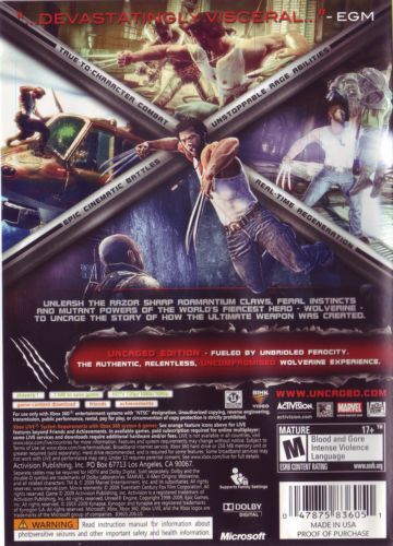 X-Men Origins: Wolverine is an epic action-adventure featuring a true-to-character Wolverine gameplay experience that takes gamers through and beyond the movie's storyline. Set in a variety of vivid real-world locales, the title challenges players to hone their animal instinct as they uncover hidden dangers, hunt and destroy enemies, and take on seemingly insurmountable situations while discovering the truth about Wolverine's tragic past. With razor-sharp adamantium claws unsheathed, the future X-Man enacts lightning-quick combat, evasive maneuvers, in-depth combo attacks, and an array of brutal finishing moves. Wolverine doesn't just deliver massive damage, either – he also takes it, thanks to his mutant regenerative power that heals him in real time right before the player's eyes.