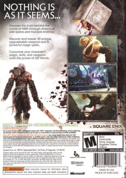 Nothing is as it seems in Nier. Assume the role of the unyielding titular protagonist, Nier, in his quest to discover a cure for his daughter who is infected with the Black Scrawl virus. With powerful allies and a mysterious book, Nier encounters things that will confound even the mightiest of warriors.