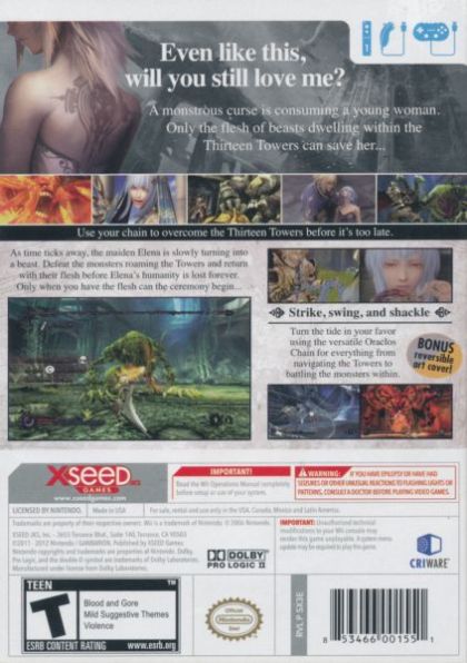 The world of Pandora's Tower features 13 gruelling environments to tackle, each one based within a tower structure, and each one home to grim monsters whose flesh takes on a macabre significance in the game's engrossing plotline. Enemies can be attacked in two ways - with a bladed weapon offering hard-hitting results up close, or with a magical chain possessing uses that extend far beyond overcoming opponents. Aimed by pointing the Wii Remote at the screen, the chain can be used to latch onto elements of the environment, allowing the player to reach new heights, activate levers or pull down parts of their surroundings. The chain also acts as the ultimate restraint when tackling monsters, allowing for innovative combat techniques as you engage in fast and furious real-time battles.