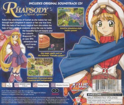 Rhapsody Follow the adventures of Cornet as she makes her way through Marl's Kingdom in search of her one true love. With the help of her trusty magical horn she enlists the help of many magical creatures along the way to battle the beautiful but evil Marjoly and her cohorts. Rhapsody is an epic RPG adventure that you'll never forget.