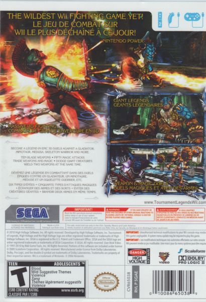 Tournament of Legends cinematic effects and graphics are fueled by the High Voltage Software Quantum 3 engine, specifically designed and optimized for Wii. Large 3D mythological fighters move fluidly while all fighting arenas, characters, and magical attacks are polished by advanced real-time lighting, blended animation, cinematic colour curves and more.