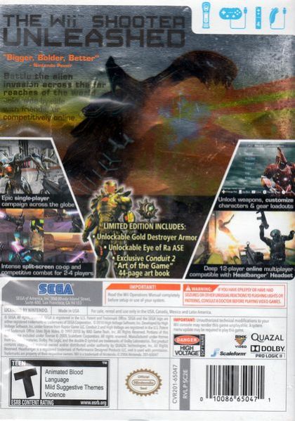 Building upon the success of the original, Conduit 2 takes players to the far reaches of the world to stop an alien invasion which can be fought in single-player, online multi-player battles, and all-new off and online co-op modes. Armed with advanced and powerful weapons, players can expect massive action in large, multi-tiered levels featuring dynamic environments, cinematic battles, giant adversaries, and deep customisation features.