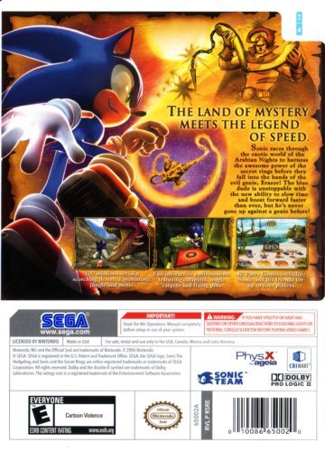 Sonic brings his trademark speed and attitude to the Nintendo Wii in his first solo adventure since 1991. In Sonic and the Secret Rings, Sonic finds himself in the colorful and vibrant world of the Arabian Nights tales. There he embarks on his most outrageous journey to date through an expansive 3D world brought to life with realistic water reflections, light bloom, and lifelike physics.