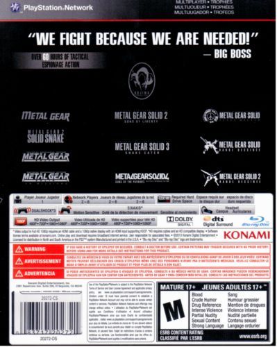 From the critically acclaimed director, Hideo Kojima, METAL GEAR SOLID: The Legacy Collection offers the most complete METAL GEAR SOLID experience ever. Featuring eight complete games, METAL GEAR, METAL GEAR 2, METAL GEAR SOLID 1, METAL GEAR SOLID 2: HD Edition, METAL GEAR SOLID 3: HD Edition METAL GEAR SOLID 4: Trophy Edition, METAL GEAR SOLID: Peace Walker HD Edition, and METAL GEAR SOLID: VR MISSIONS along with two Ashley Wood Digital Graphic, the Legacy Collection offers Metal Gear and stealth action fans a chance to experience all the heroic game play, compelling design and immersive storytelling of the MGS franchise in one complete package.