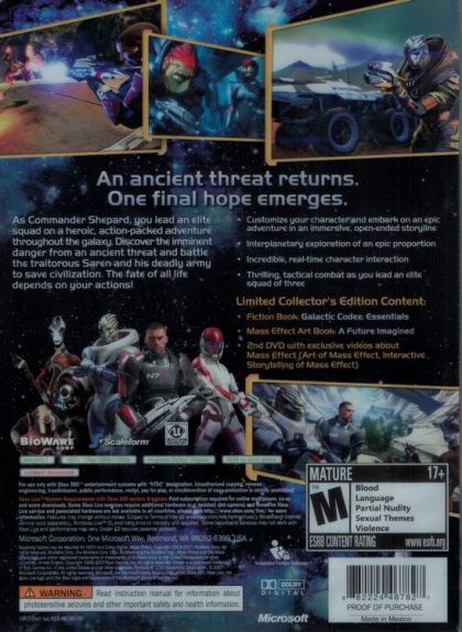 Mass Effect is a science fiction action-RPG created by BioWare Corp., the commercially and critically acclaimed RPG developer of "Jade Empire," "Star Wars: Knights of the Old Republic," "Neverwinter Nights," and the "Baldur's Gate" series. "Mass Effect" will deliver an immersive story driven gameplay experience with stunning visual fidelity. Published by Microsoft Game Studios, "Mass Effect" will be exclusively for the Xbox 360 video game system.