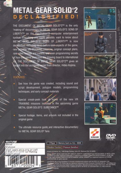 The Document of Metal Gear Solid 2 gives a behind-the-scenes look at Metal Gear Solid 2: Sons of Liberty. You'll receive a thorough education on all aspects of Sons of Liberty, including original concept plans, rare video footage and trailers, and even programming secrets. Also included are playable VR training missions from Metal Gear Solid 2: Substance. With in-depth footage and insider information, The Document of Metal Gear Solid 2 is a complete resource guide for Metal Gear Solid fans.