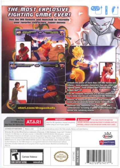 Dragon Ball Z: Budokai Tenkaichi 2 will offer fans the ultimate Dragon Ball experience as players will be able to mimic signature moves using the Wii Remote and Nunchuk as they are performed in the Dragon Ball Z animated series, such as Goku(r)'s Kamehameha, a devastating energy attack performed by moving both hands. The result is a heart-pounding experience unlike any other. In Dragon Ball Z: Budokai Tenkaichi 2 all DBZ skills and abilities are intact including: free flight, range, and melee attacks. With over 100 DBZ warriors, the game offers players an action-packed single-player mode complete with missions and side quests culminating in some of the most high energy boss confrontations ever.