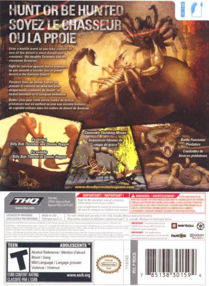 Deadly Creatures is a 3rd person action thriller set amidst a desert world of venomous terror, built exclusively for the Nintendo Wii. Players will control an armored Scorpion and a deadly Tarantula as they fight for survival against Gila monsters, lizards, black widows and many more terrifying creatures. Featuring intuitive motion controls and a deep combo-based combat system, Deadly Creatures is a thrilling mix of brutal creature-crushing action and suspenseful exploration of vast 360 degree desert and man-made environments. Gamers will explore this darkly compelling story through the eyes of two of the world's most deadly creatures.
