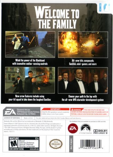 The Godfather Blackhand Edition for Wii offers countless choices for solving the family's problems with brutal violence, skillful diplomacy, or a cunning mix of both. Use your powers of loyalty and fear to earn respect through interactions with police, businessmen, racket bosses, other mobsters, and more. The decisions you make have lasting consequences, just as they do in the legendary mob underworld of The Godfather books and films.